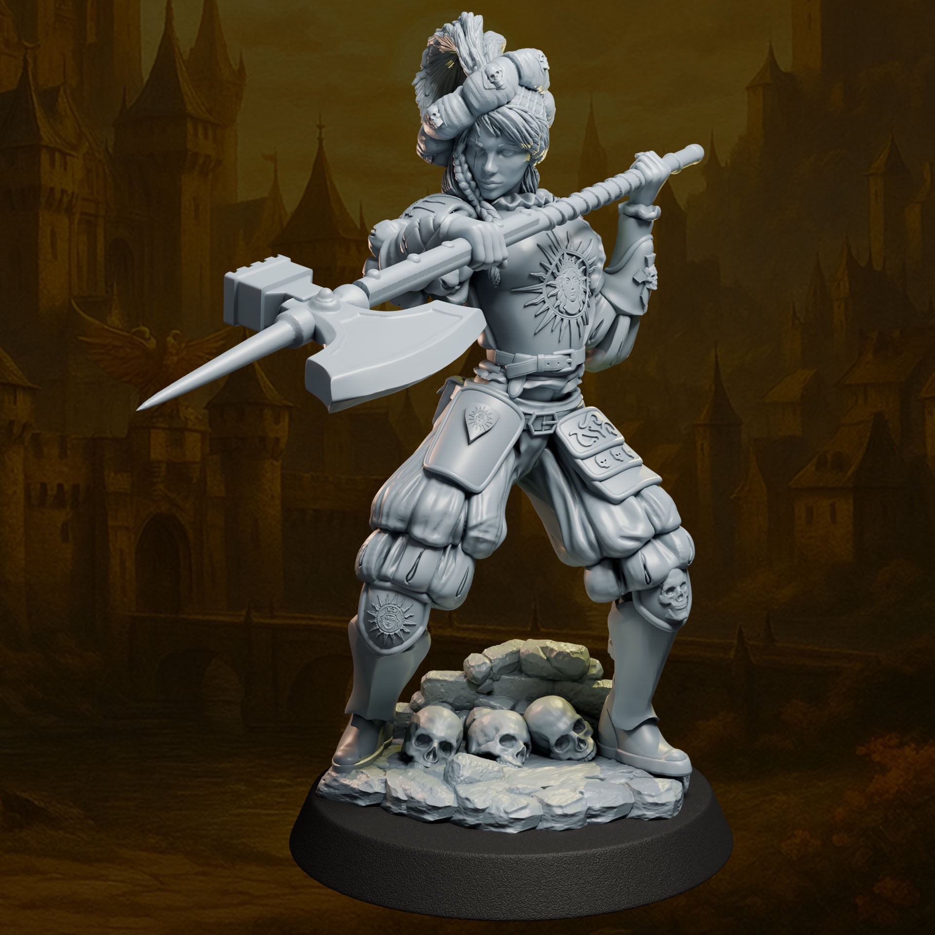 Her outfit combines elements of barbaric austerity with tactical functionality. Distinctive trousers, leather armor, and decorative details create a strong, northern aesthetic. A base with skulls and a stone circle lends the figure a brutal, grimdark character.