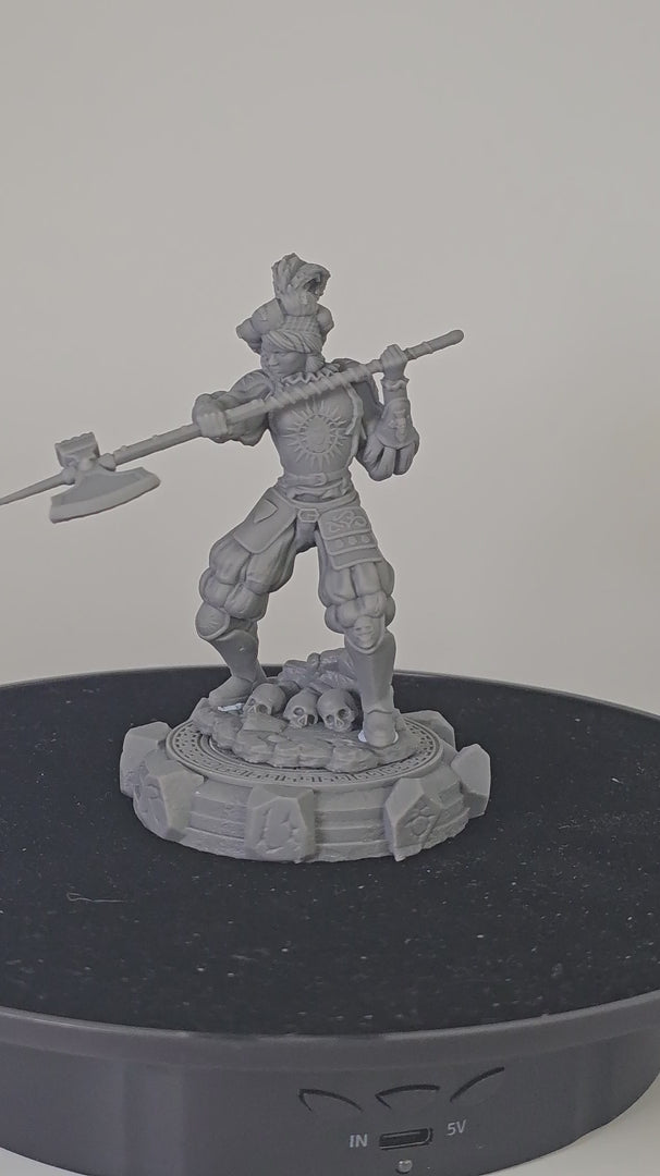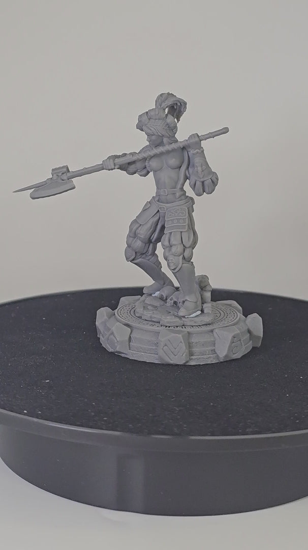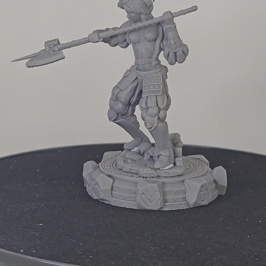 Skara is a ruthless warrior from Black Bird Miniatures' Ladies of the Dark 2 series. Captured in a dynamic battle pose, she wields a two-handed halberd ready for a powerful strike.
