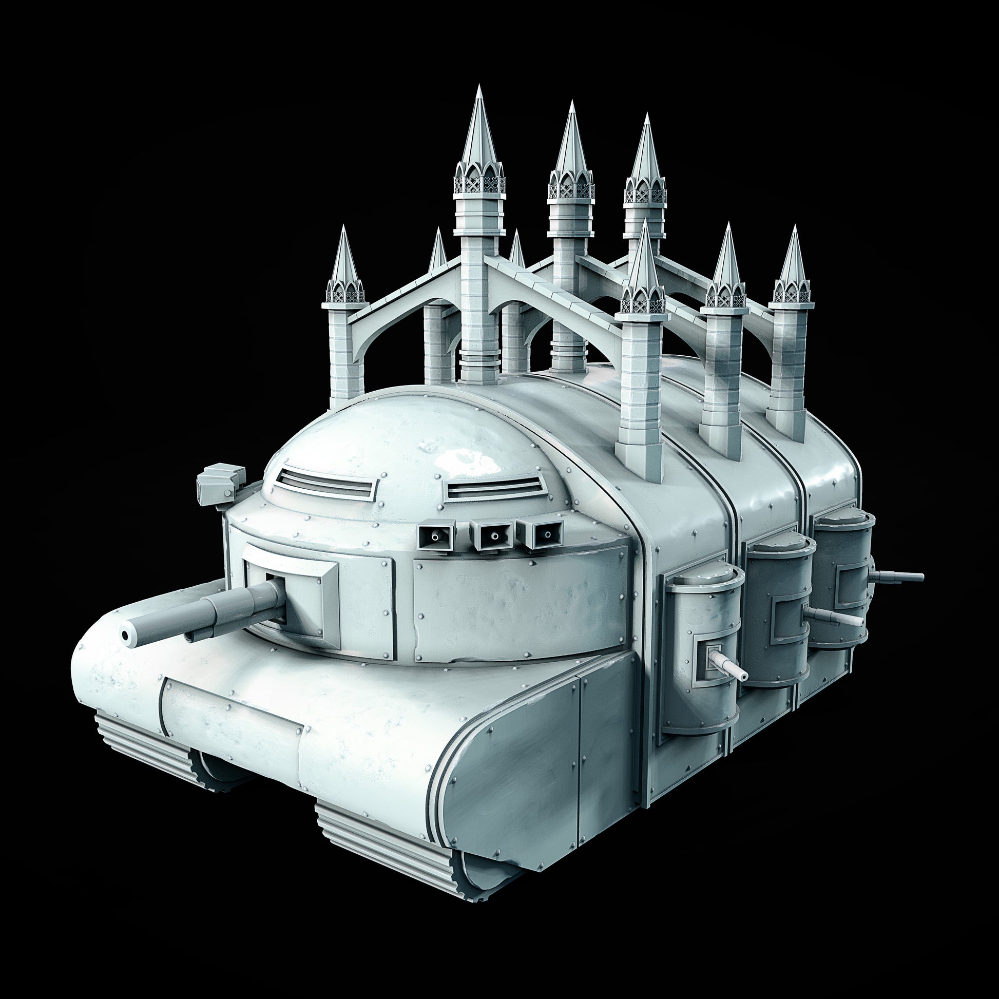 Czołg Kościelny V1B autorstwa Juan Manuel Vargas Villate to masywny model pojazdu bitewnego w klimacie grimdark i gothic war machines, stworzony z myślą o systemach takich jak Trench Crusade i inne gry figurkowe. Charakterystyczna półkolista kopuła, masywny pancerz z nitami i działem osadzonym w wieżyczce nadają mu unikalny wygląd kościelnej machiny wojennej.