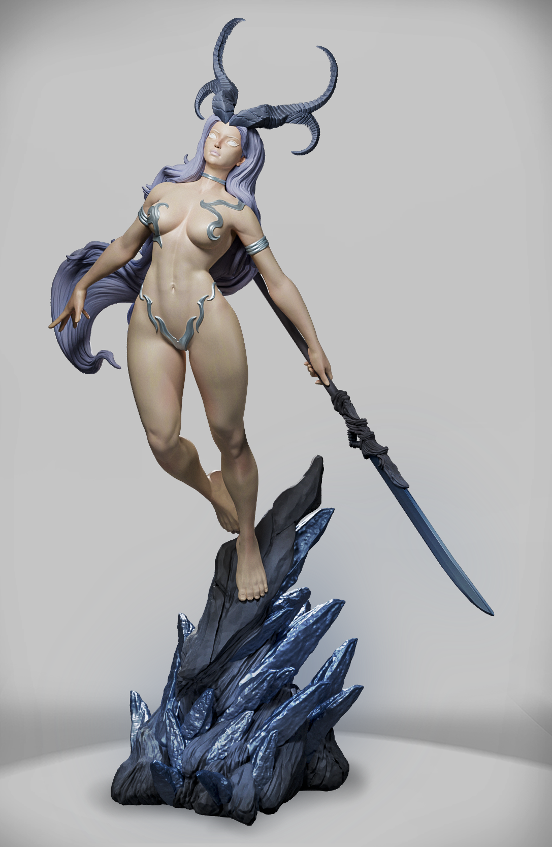 Demoniczna Władczyni Otchłani to potężna i hipnotyzująca postać fantasy, unosząca się nad krystaliczną podstawą niczym istota z innego wymiaru. Rogata sylwetka, płynna poza oraz monumentalny miecz tworzą model o wyjątkowo mrocznym i zmysłowym charakterze.