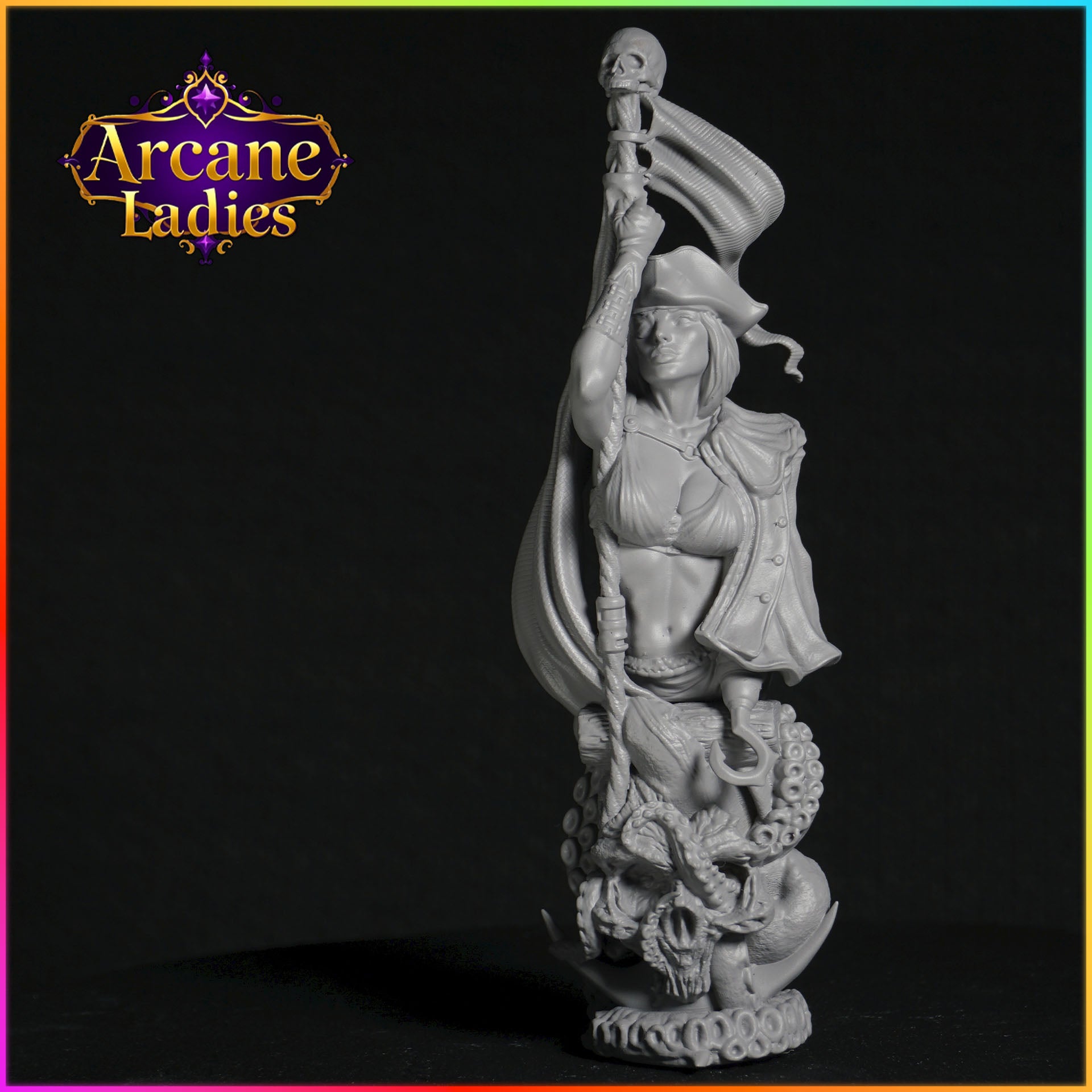 Na pokładzie przeklętego okrętu, pośród trzaskających żagli i morskiej piany, stoi Ravena – piratka o sercu dzikim jak ocean. Jej postawa, pełna odwagi i dumy, łączy w sobie urok kapitana i grozę władczyni głębin. Bogate detale – od czaszki oplecionej mackami po powiewający sztandar – czynią z tej figurki prawdziwe dzieło sztuki kolekcjonerskiej.