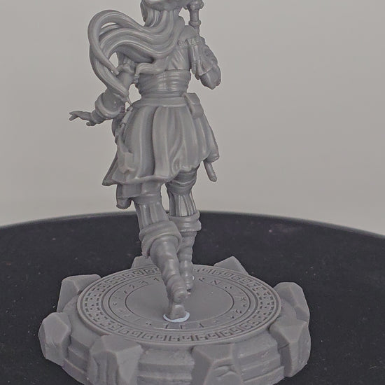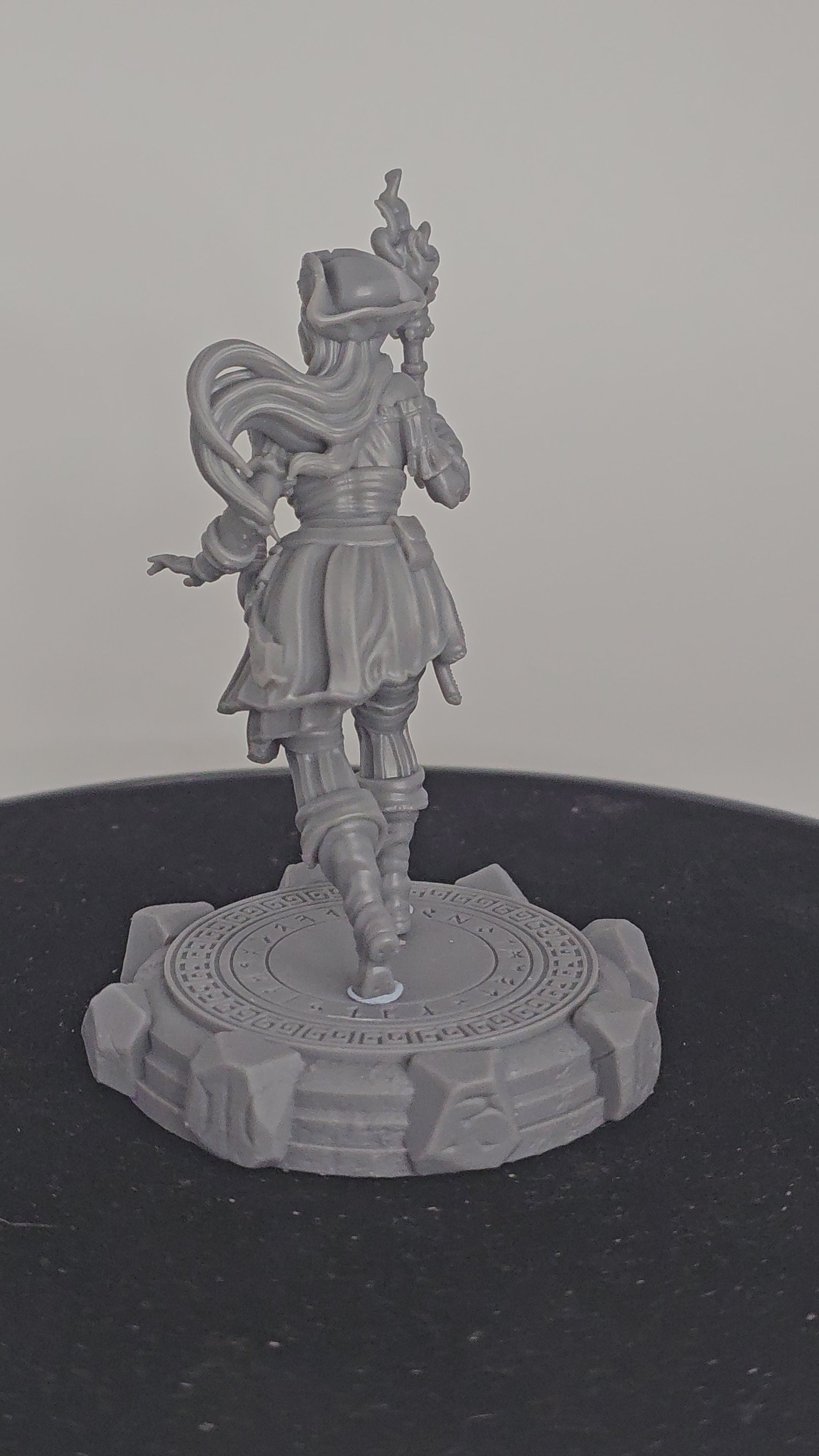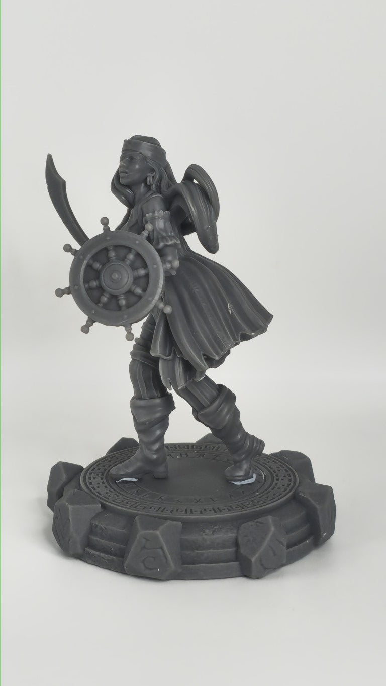 Figurka wyróżnia się detalami charakterystycznymi dla morskich opowieści – od klasycznego pirackiego kapelusza (tricorn) z symbolem czaszki, po zdobione rękojeści broni i dynamicznie ułożone szaty. To idealny wybór dla graczy RPG potrzebujących charyzmatycznej postaci liderki lub dla kolekcjonerów szukających unikalnego modelu do malowania.
