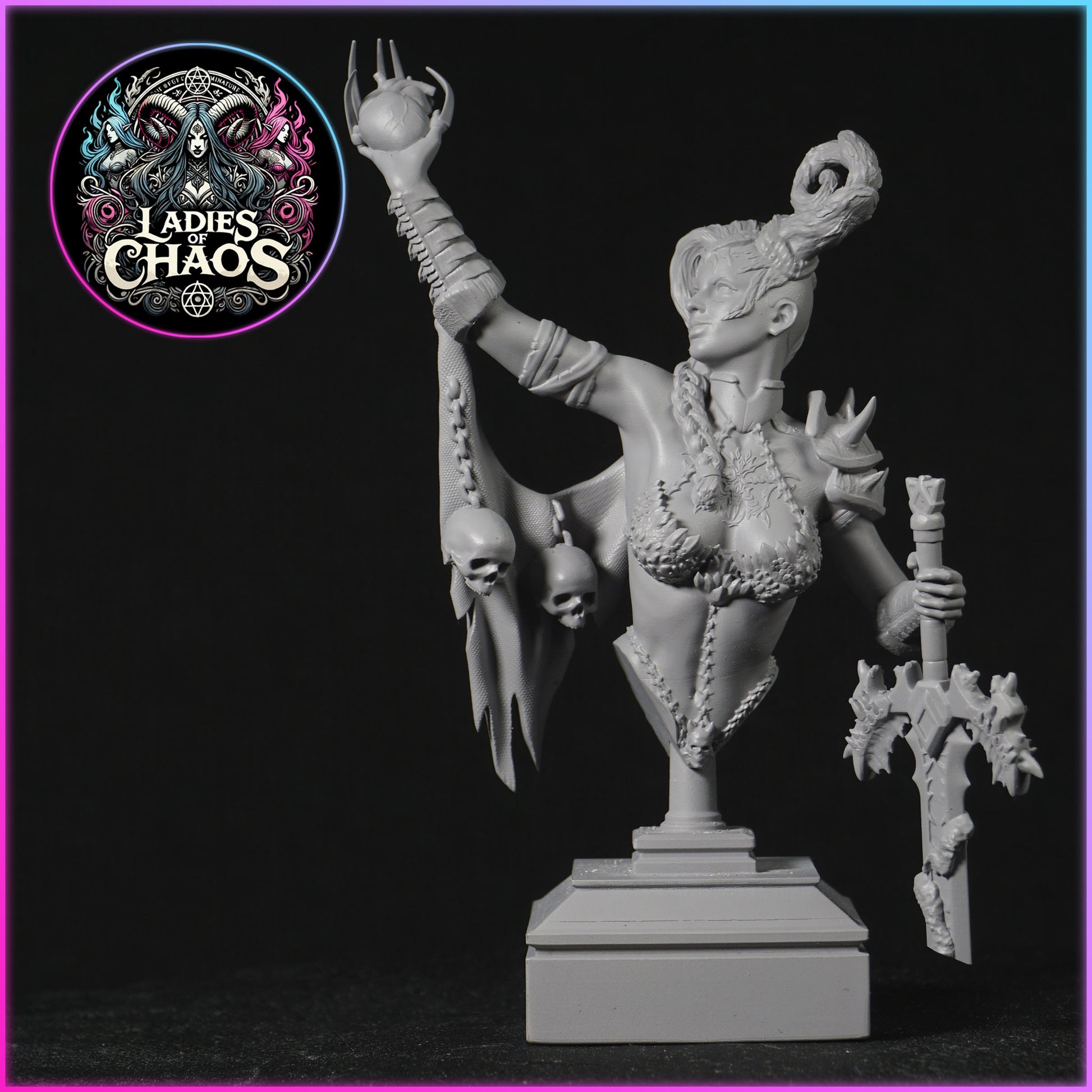 Nyxara to kapłanka chaosu, która triumfalnie wznosi czaszkę nad swym tronem ze skał i kości. Jej ciało ozdobione rytualnymi znakami i makabrycznymi trofeami sprawia, że każdy detal figurki emanuje aurą mroku i potęgi. To uosobienie dzikiej, nieludzkiej siły, gotowej pochłonąć każdego, kto ośmieli się jej przeciwstawić.