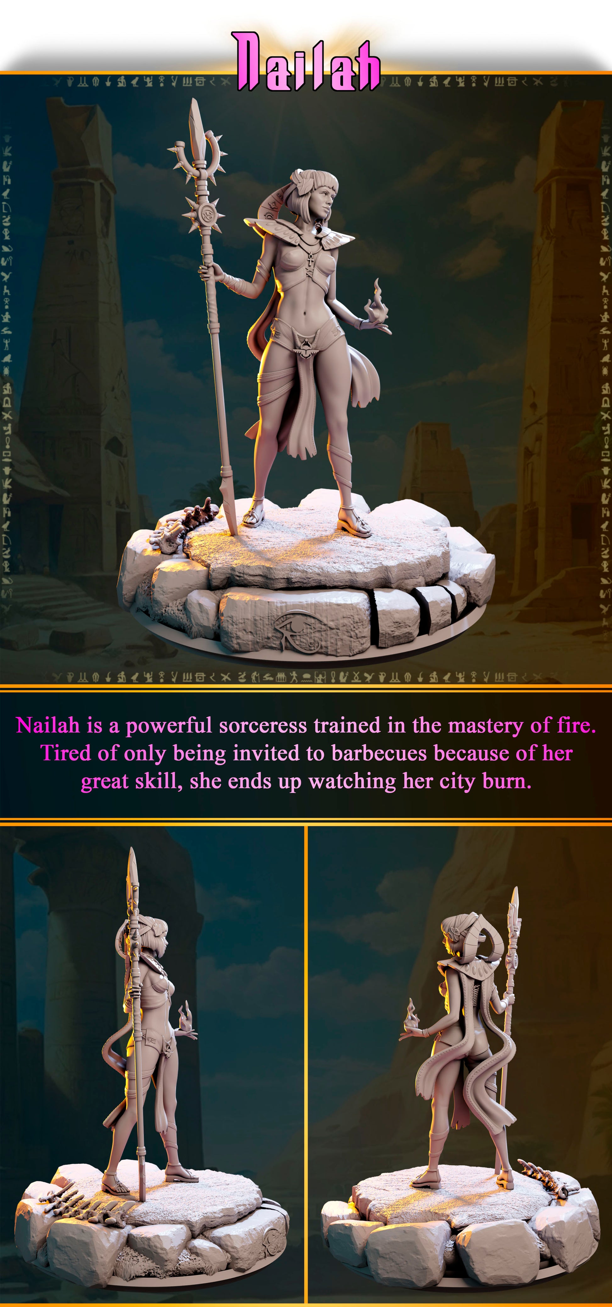 Płomień piasków i blask słońca. Nailah, Pani Ognia Pustyni, włada świętym płomieniem boga słońca. Jej spokojne spojrzenie skrywa gniew pustynnych burz, a berło w dłoni płonie starożytną mocą. To wyjątkowa figurka, łącząca elegancję z siłą i magią starożytnego Egiptu.