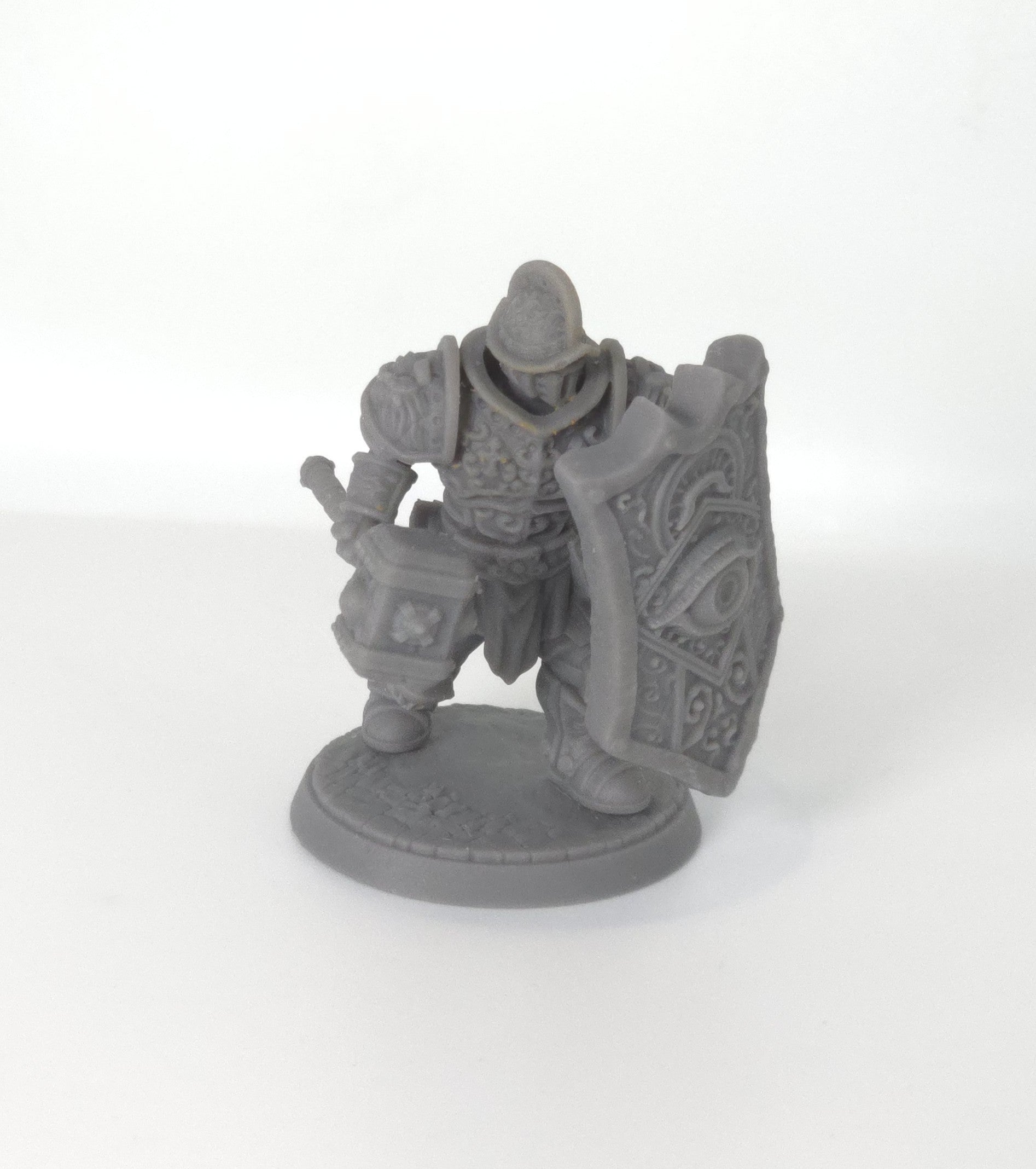 Model przedstawia ciężkozbrojnego żołnierza Papal State uzbrojonego w masywną tarczę oraz broń obuchową. Detal rzeźby jest wyraźny i czytelny, zgodny z estetyką i stylistyką uniwersum Trench Crusade.
