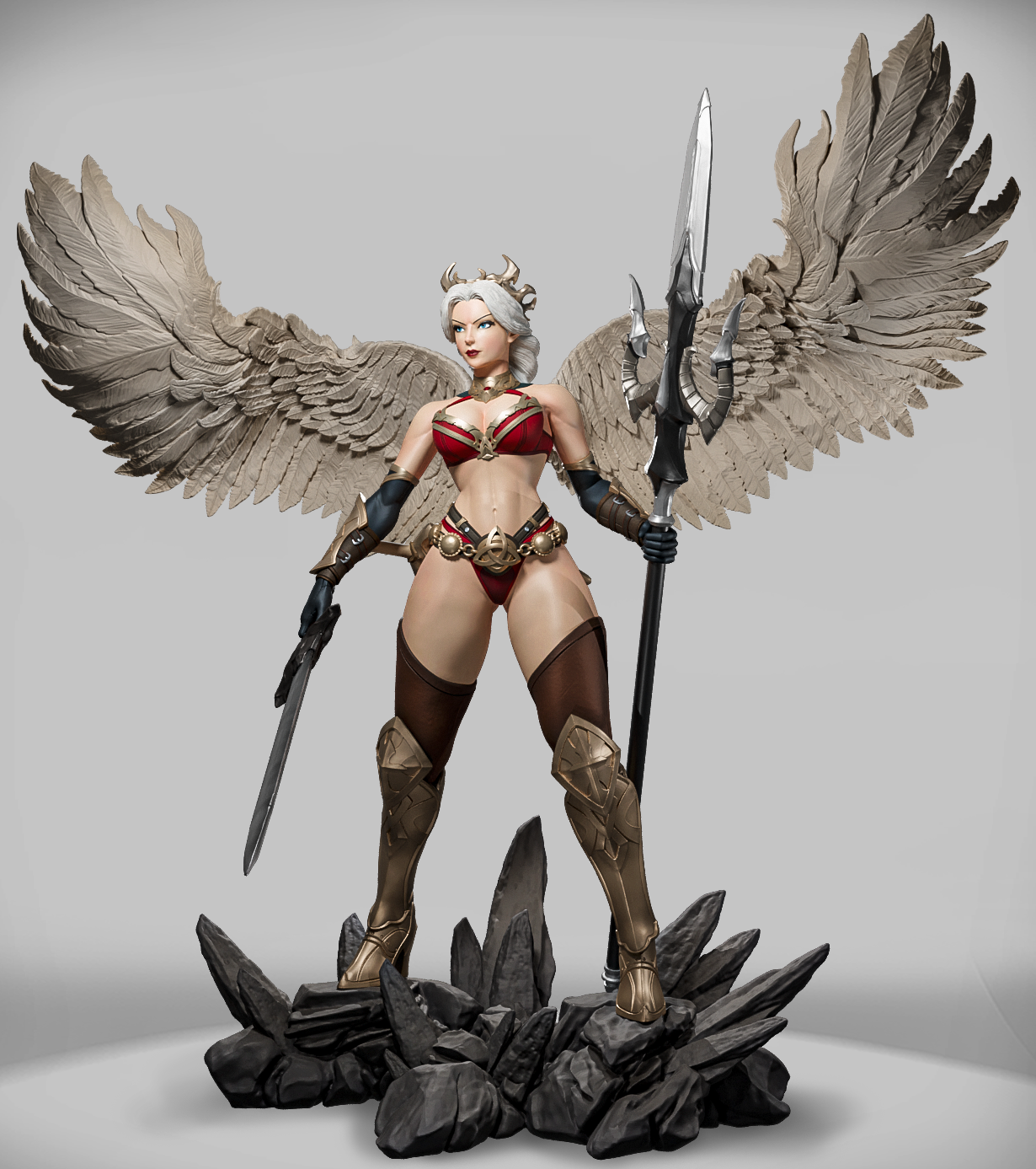 Skrzydlata Wojowniczka Świtu to heroiczna postać fantasy inspirowana mitycznymi walkiriami i boskimi wojowniczkami. Monumentalne skrzydła, zdecydowana poza oraz uzbrojenie w miecz i włócznię tworzą model o niezwykle epickim charakterze.