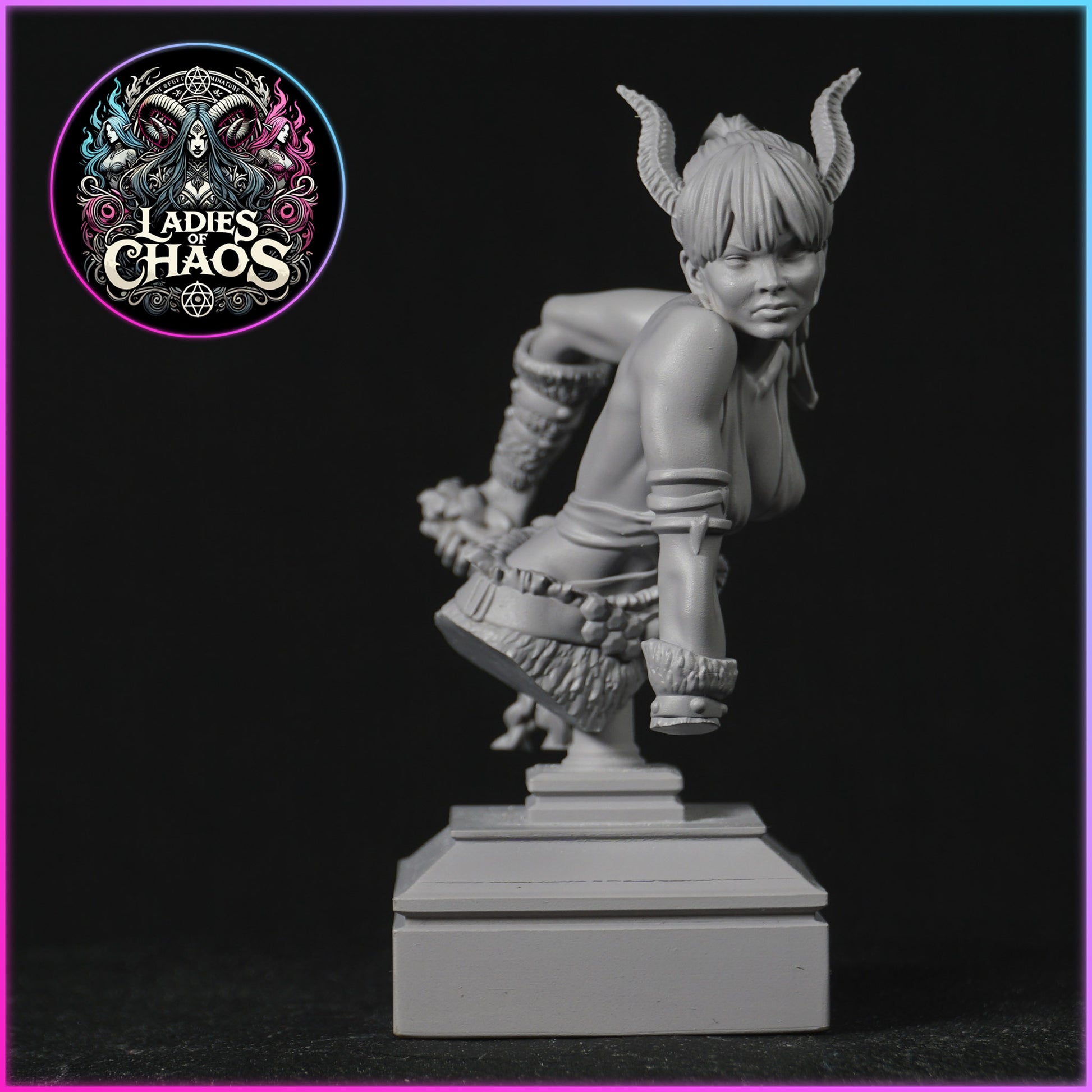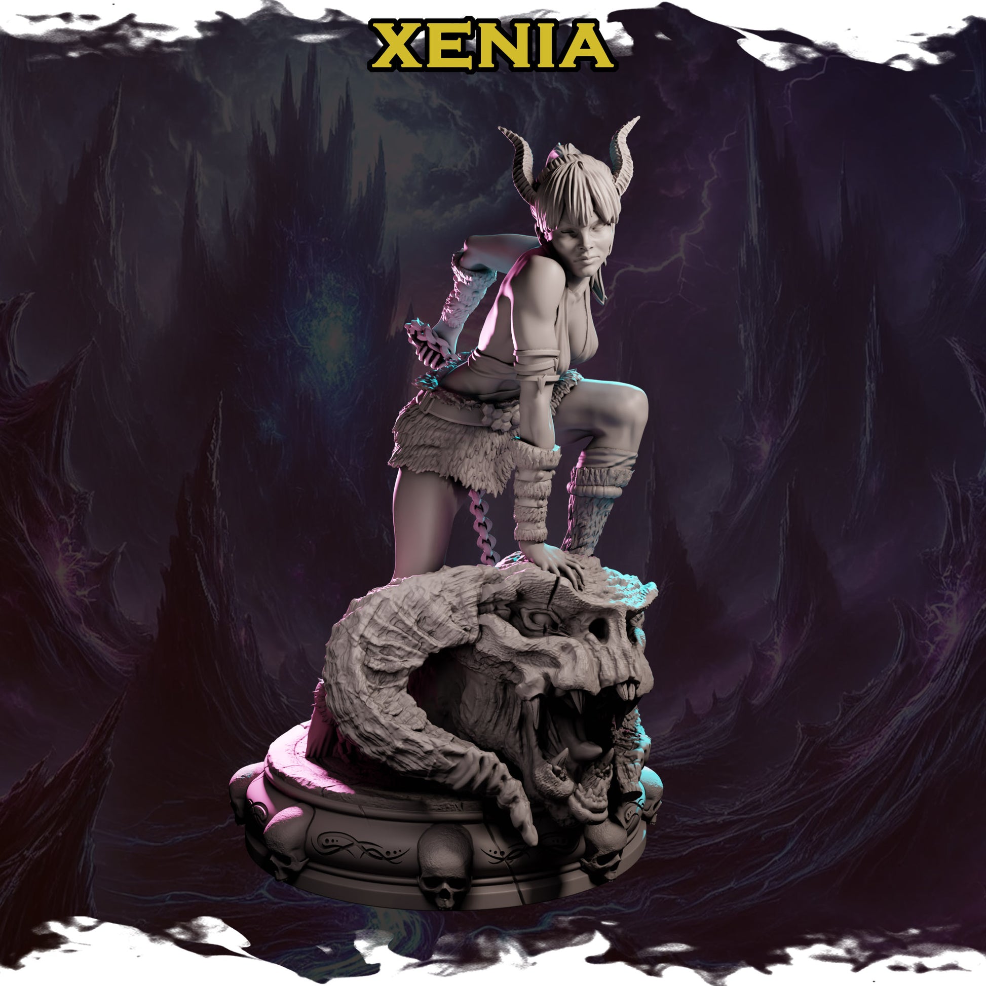 Xenia to dzika wojowniczka chaosu, której siła i determinacja wyryte są w każdym ruchu. Opierając się na czaszce demonicznej bestii, jawi się jako triumfatorka pradawnych bitew. Jej postura pełna buntu i pewności siebie sprawia, że figurka emanuje mocą, idealnie oddając klimat mrocznego fantasy.